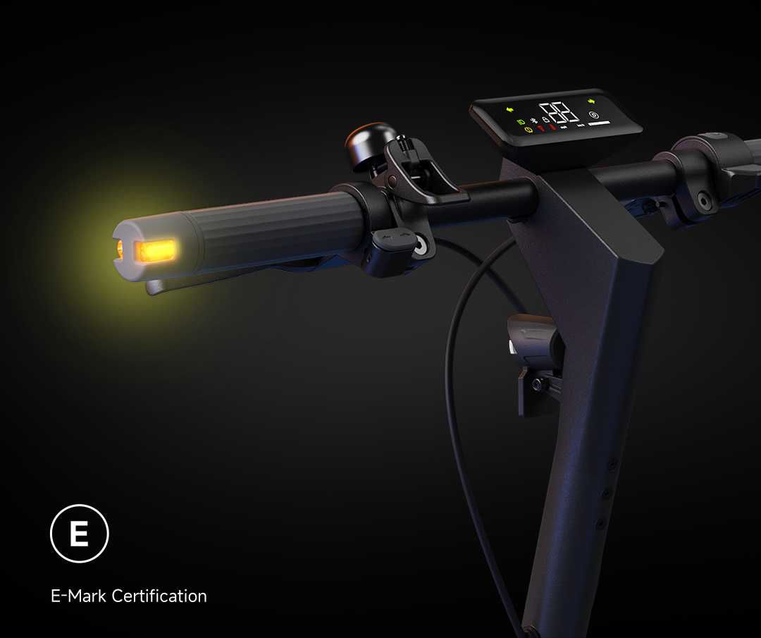 Featuring E-Mark certified integrated front and rear turn signal lights, ensuring compliance with rigorous European safety standards.