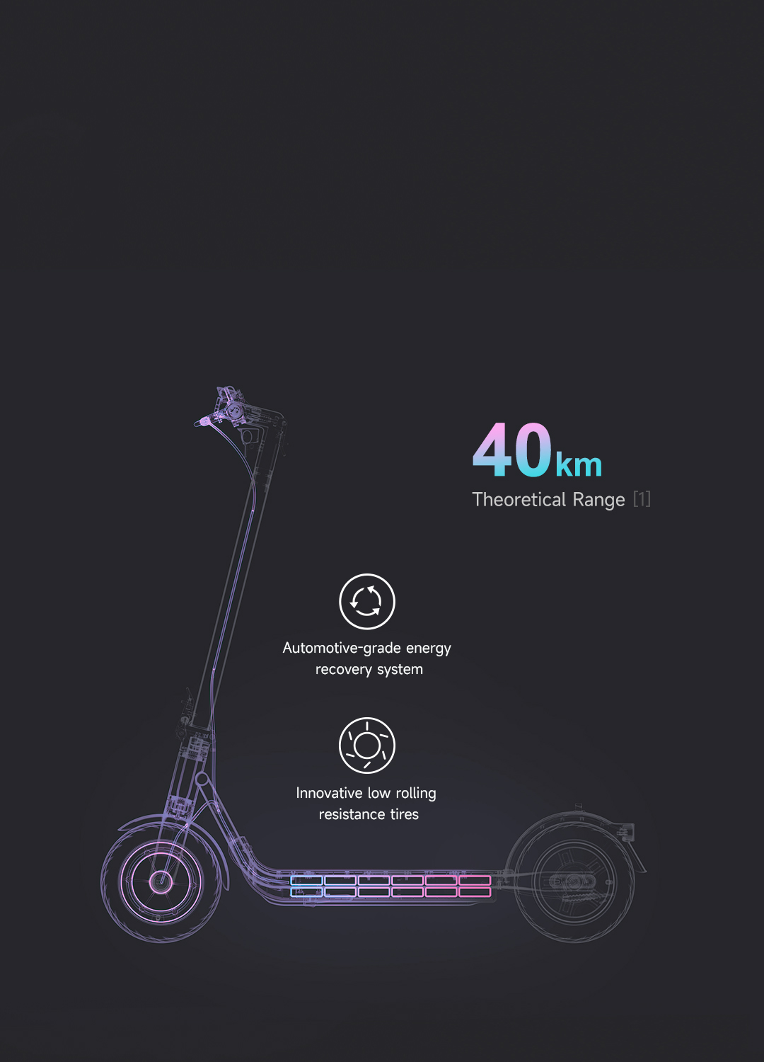 *Max. Range 40km: Tested while riding with a full battery, 75 kg (165 lbs.) load, 25°C (77°F), at 15km/h on average on pavement.