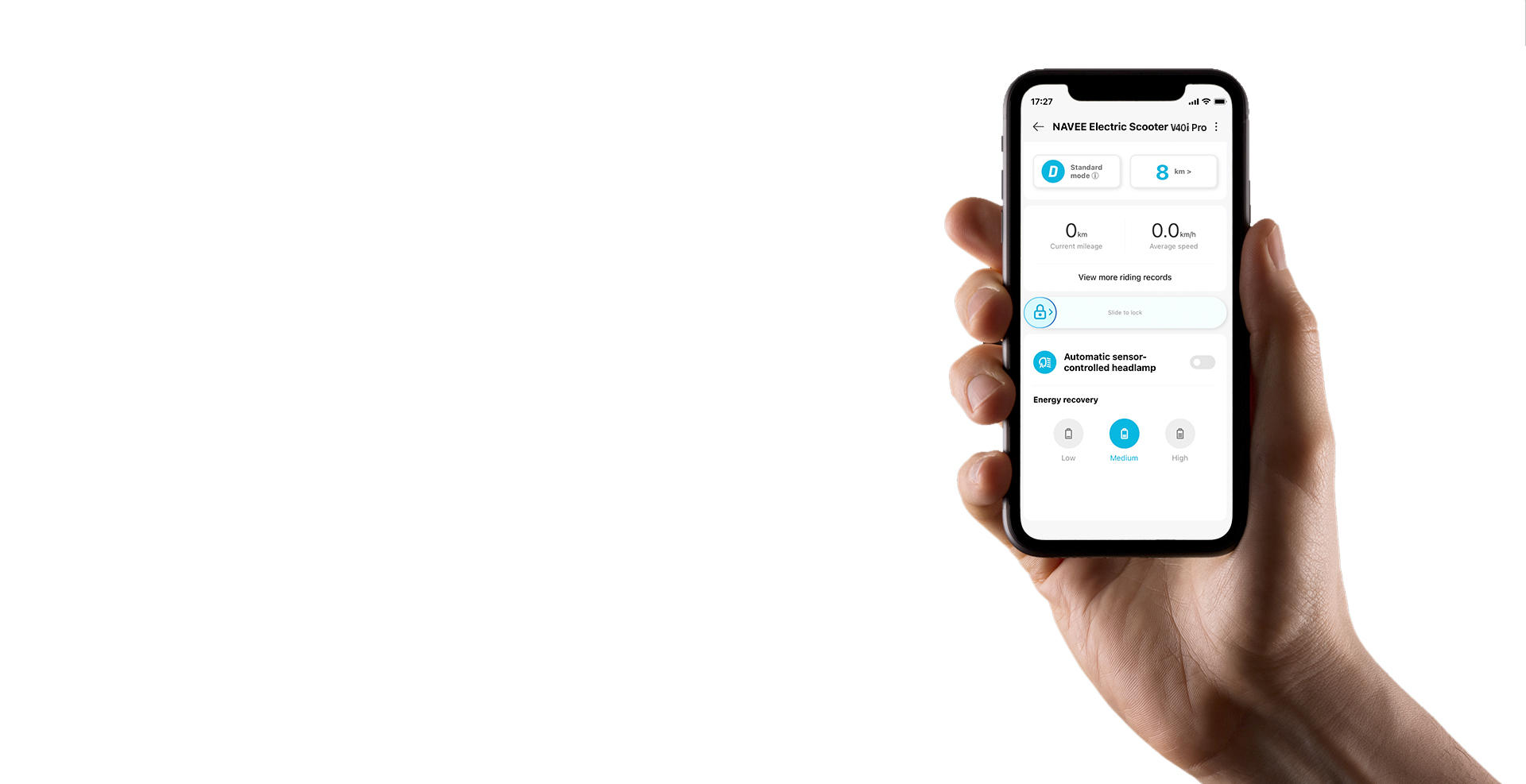A: While riding the scooter, when you twist the brake lever or release the accelerator to slide, energy recovery will be initiated, and part of the kinetic energy will be converted into electrical energy for storage and reuse. Energy recovery can increase endurance and at the same time it provides braking effect. When using it for the first time, it is recommended to set the level to “Weak”. After connecting to the Navee APP, scroll down to the bottom of the main interface of the product, you can set the energy recovery intensity, the default setting is set to weak, but you can choose the three strengths for e.g. weak, medium and strong.