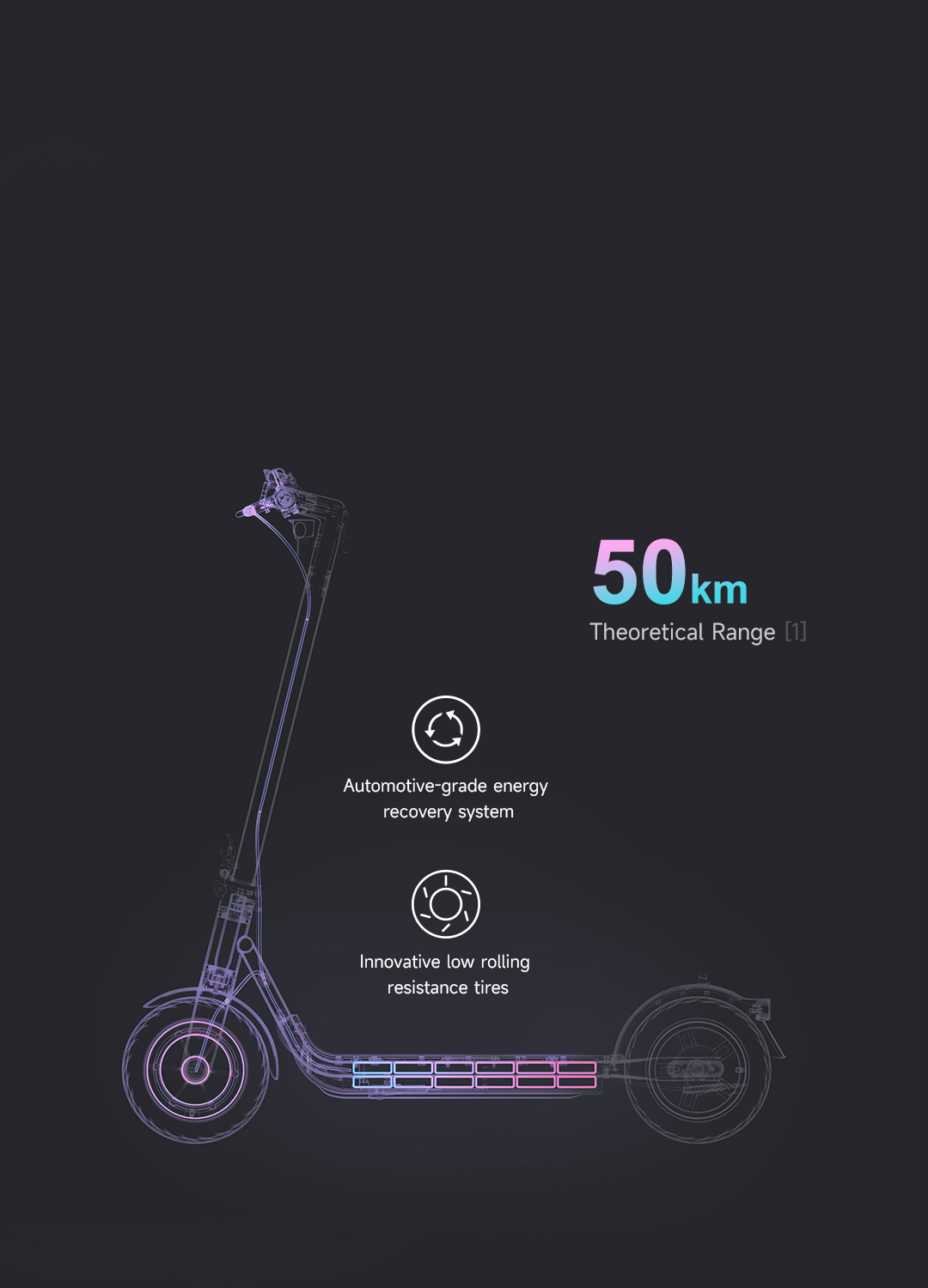 *Max. Range 50km: Tested while riding with a full battery, 75 kg (165 lbs.) load, 25°C (77°F), at 15km/h on average on pavement.