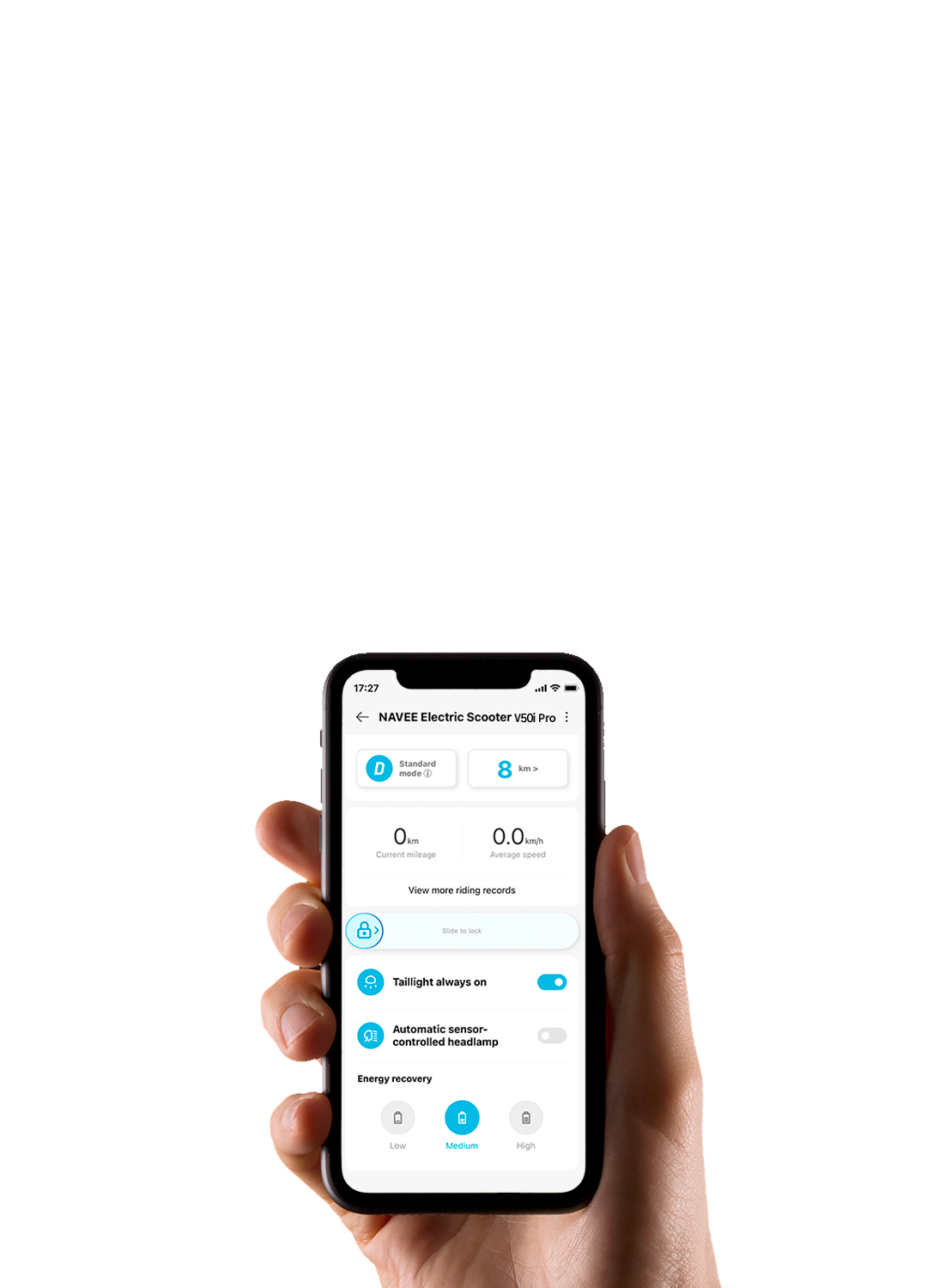 A: While riding the scooter, when you twist the brake lever or release the accelerator to slide, energy recovery will be initiated, and part of the kinetic energy will be converted into electrical energy for storage and reuse. Energy recovery can increase endurance and at the same time it provides braking effect. When using it for the first time, it is recommended to set the level to “Weak”. After connecting to the Navee APP, scroll down to the bottom of the main interface of the product, you can set the energy recovery intensity, the default setting is set to weak, but you can choose the three strengths for e.g. weak, medium and strong.